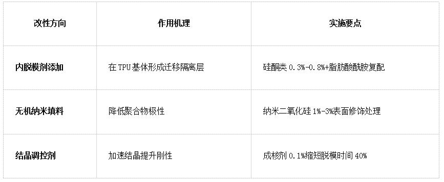 技术本质:降低TPU粘模风险的核心在于打破分子间作用力链。表层通过纳米工程构建物理隔离屏障,材料本体借助改性剂切断极性键合路径,配合注塑参数精准抑制粘弹滞留效应。